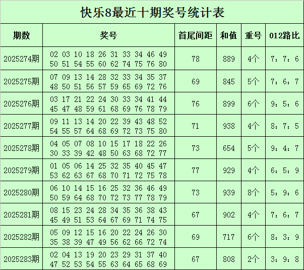 福彩快乐8第2025283期开奖回顾:02 04 13 19 20 23 29 31 37 40 47 52 53 54 55 63 64 65 68 69,其中奖号首尾间距为67,和值为808,012路比为3:9:8,包含7组同尾号码:20-40、02-52、13-23-53-63、04-54-64、55-65、37-47、19-29-69,开出2个重号:20、47。