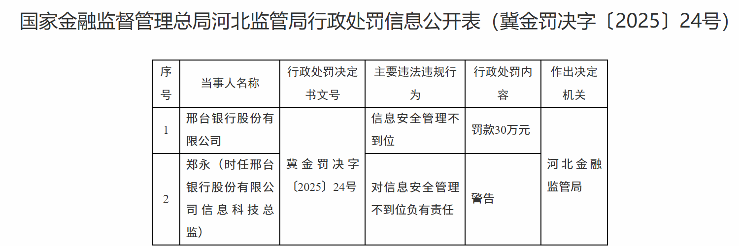 股票配资最新消息邢台银行因信息安全管理不到位被罚款30万元 股票配资最新消息 来源:正规股票配资开户 网站:炒股可以杠杆的平台,手机股票配资平台,实盘配资公司 日期:2026-01-07 07:38:08 查看:55