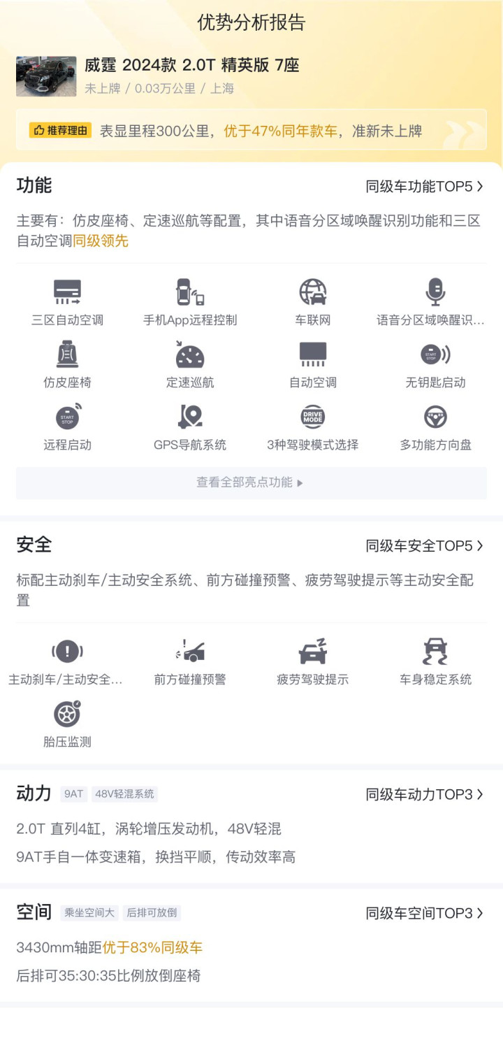综上所述的新车含税价、用车成本、市场行情、优势分析、同款比价等数据仅供参考。在配置部分,因为二手车非标品,车辆可能会存在配置改装的情况,具体车况信息需要线下结合车辆实际情况进行综合参考。