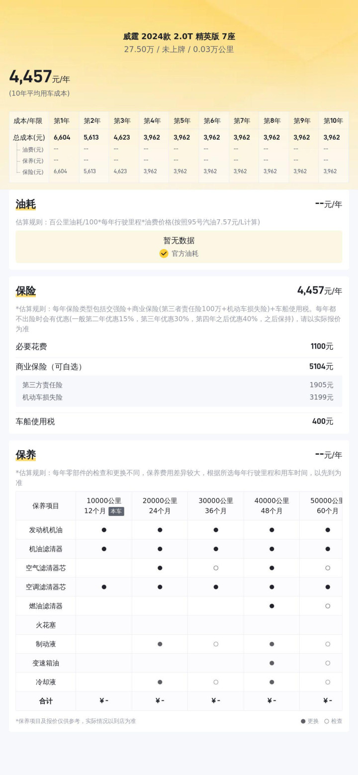 在不考虑贷款利息的情况下,购买这辆二手奔驰威霆精英版的三年总成本预计约为6.9万元。这里我们暂且假设每年行驶里程为2.5万公里,虽然听似夸张,但若将其作为营运车辆使用,这一里程数并非不可能。接下来,让我们一一拆解这些费用。年均加油成本:约3.1万元年均保养成本:约为4,500元年均保险成本:约1.1万元其他费用:包括洗车、打蜡等日常美容费用,以及停车费、过路费、车船使用税(每年480元)等,这些费用因人而异,但在这里我们暂估其年均总成本约为1万元。值得注意的是,上述所有费用均受多种因素的影响,包括驾驶习惯、油价波动、保险政策等。因此,实际用车成本可能会有所差异。此外,如果您选择贷款购车而非全款购买,那么还需要考虑贷款利息等额外费用。综上所述,虽然6.9万元的三年总成本看似不菲,但考虑到这辆威霆精英版的高性能和豪华配置,这一价格或许仍具有相当的性价比。但话说回来,具体值不值得购买,还是要看各位怎么想了。