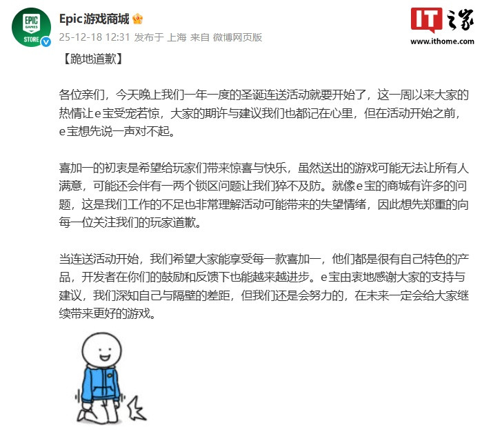 IT之家12月18日消息,Epic游戏商城一年一度的圣诞连送活动将于今晚开始,官方却在今日中午向玩家道歉,称送出的游戏可能无法让所有人满意,可能还会伴有一两个锁区问题,因此想先郑重地向每一位关注我们的玩家道歉。