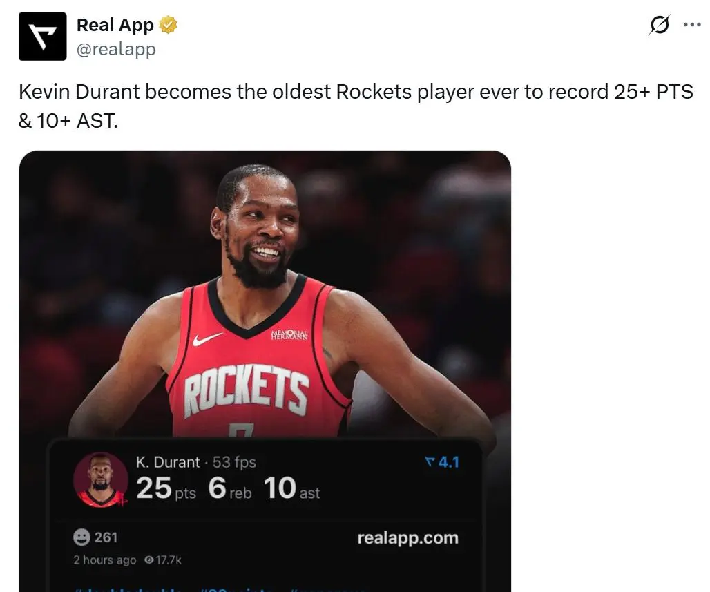 凭借这样的表现,37岁180天的杜兰特成为火箭队史单场至少得到25分10助最老的球员,同时继续保持本赛季杜兰特助攻上双火箭不败的金身。