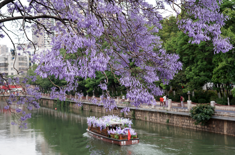 连日来,云南省昆明市教场中路、盘龙江畔的蓝花楹竞相绽放,吸引众多市民和游客前来打卡拍照,共赴紫色花海之约。