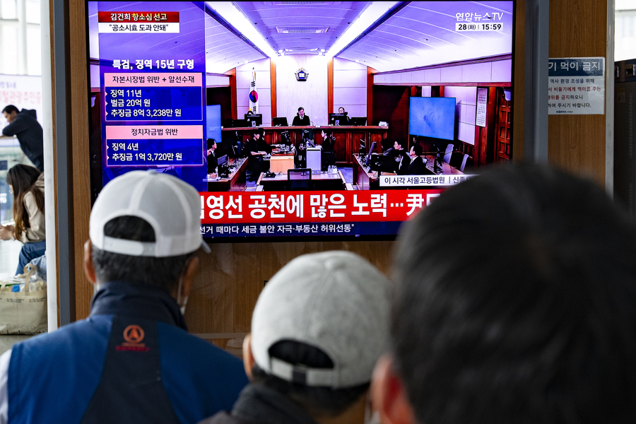 4月28日,韩国首尔,人们在首尔站观看法院对金建希的量刑直播。