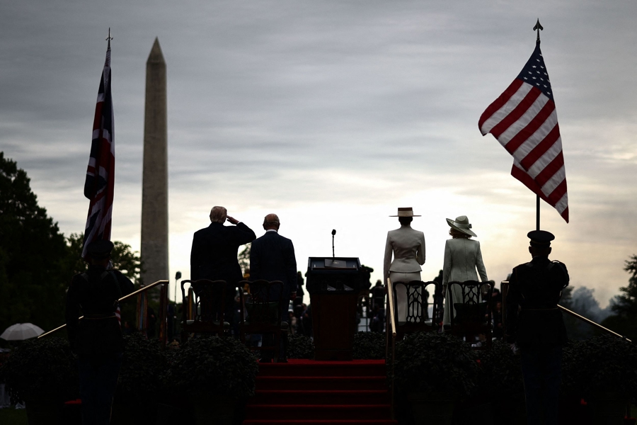 4月28日,美国总统特朗普、第一夫人梅拉尼娅与英国国王查尔斯三世、女王卡米拉在白宫出席欢迎仪式。