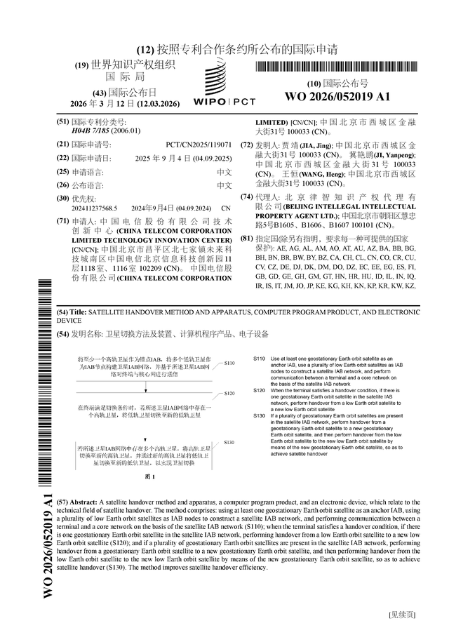 证券之星消息,根据企查查数据显示中国电信(601728)公布了一项国际专利申请,专利名为“卫星切换方法及装置、计算机程序产品、电子设备”,专利申请号为PCT/CN2025/119071,国际公布日为2026年3月12日。