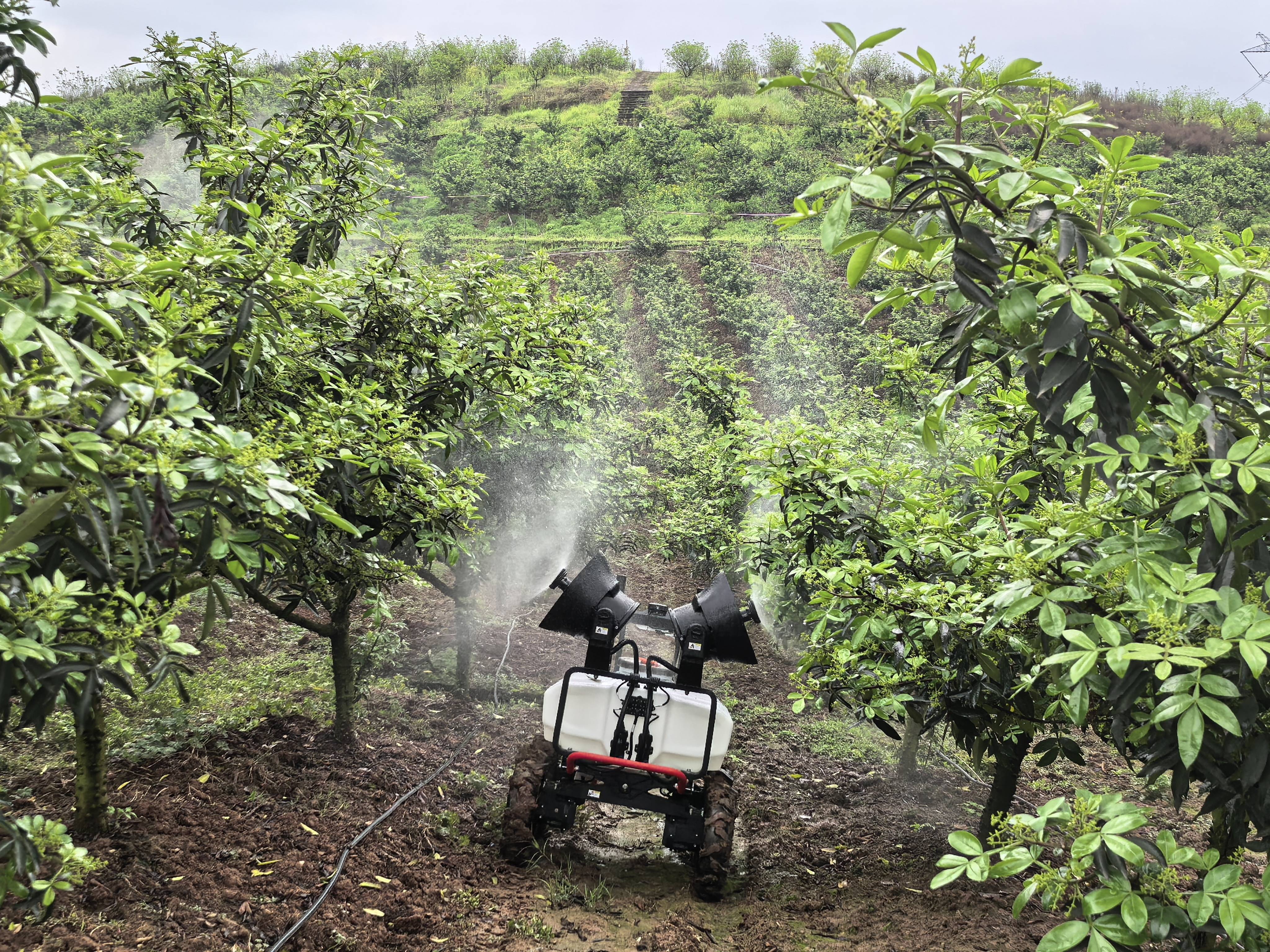 3月下旬一场春雨过后,重庆市江津区慈云镇“美宜佳花椒智慧农业基地”,近300亩花椒树郁郁葱葱,如同给山坡披上了绿装。尽管地形起伏大、雨后山坡湿滑,六轮无人植保车依然可以穿梭在花椒树间,精准施药预防病虫害。